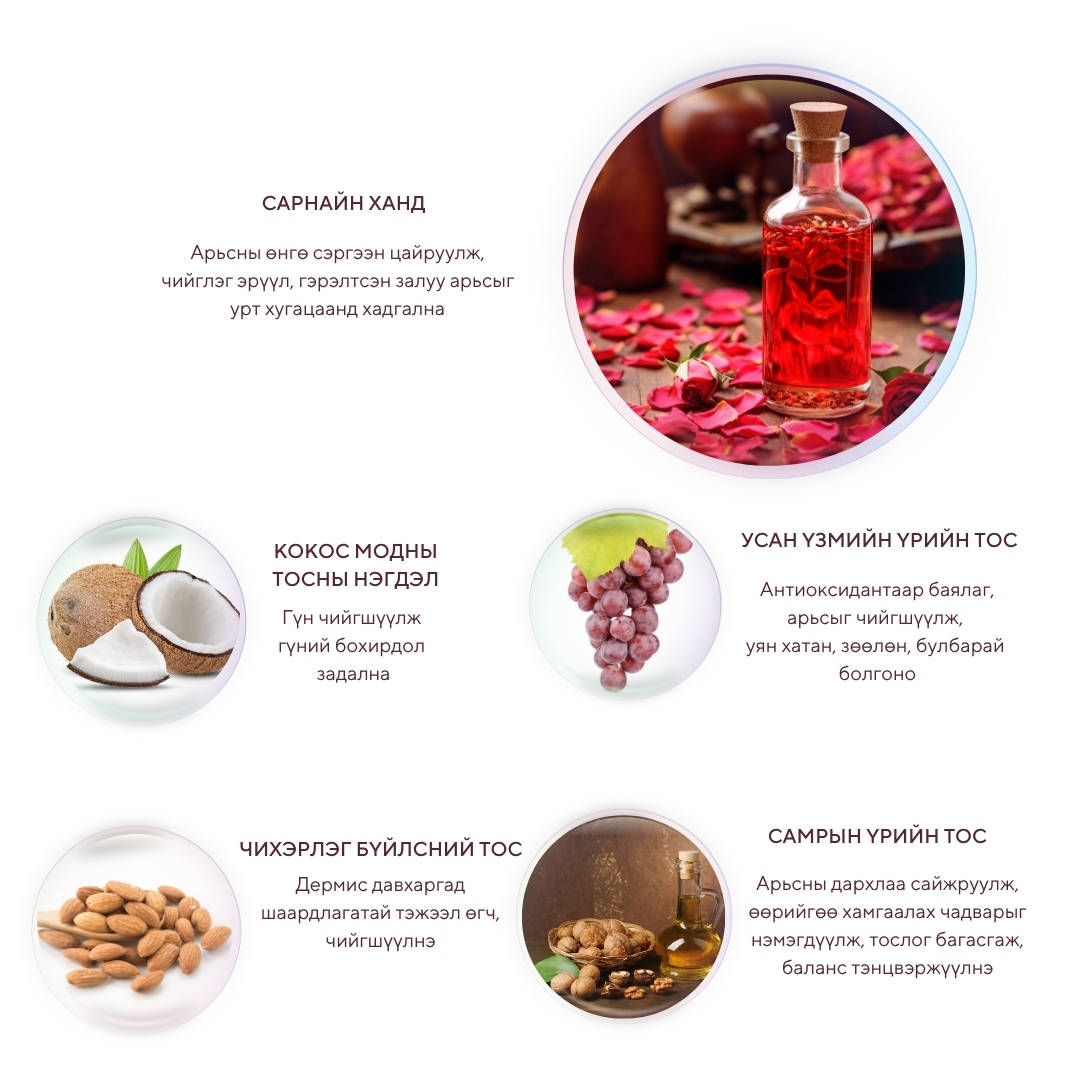 Будаг, нарны тос, арьсны тослог, үхэжсэн эд эсийн үлдэгдэл гэх мэт арьсны нүх сүвэнд байж болох бүх бохирдлыг хайлуулан цэвэрлэж, арьсны өнгө цайруулж чийгшүүлнэ