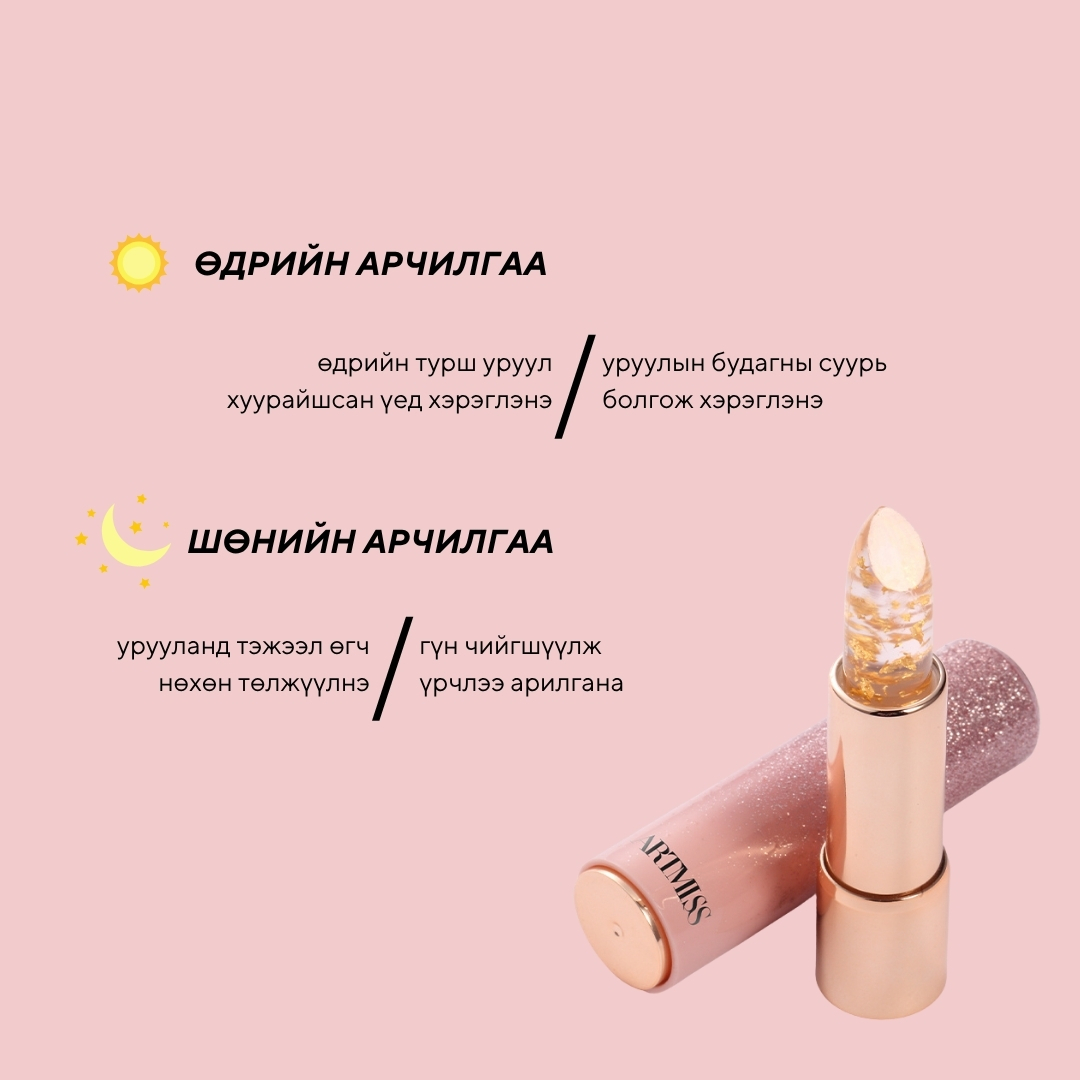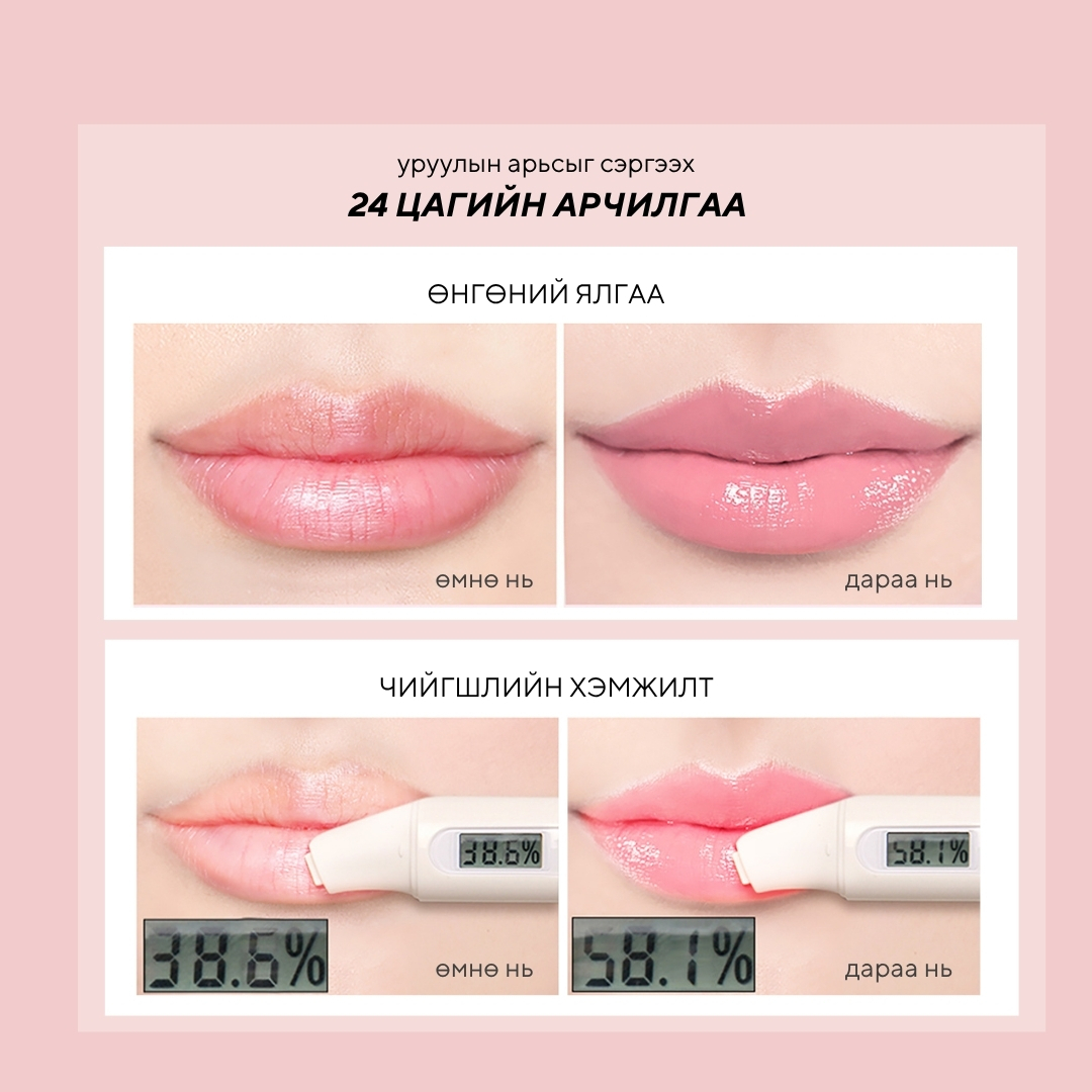 Уруулын үрчлээ тэнийлгэж, урт хугацаанд чийгшил тэжээлээр хангаж, булбарай зөөлөн болгож, уруулын хатсан, хагарсан, хомхой зэрэг өвчнийг эдгээнэ