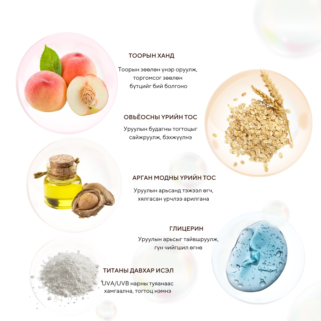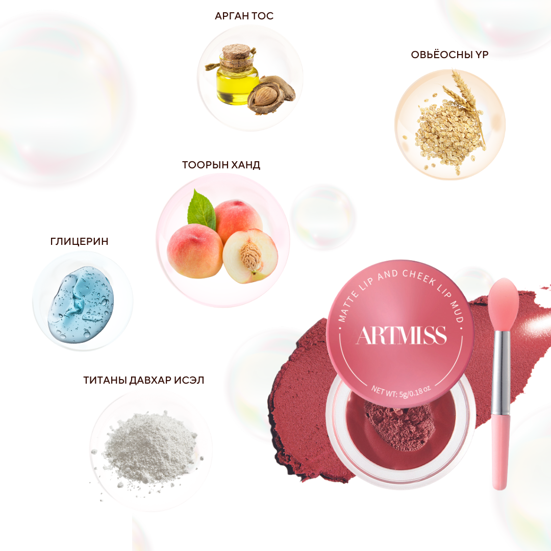 Өдрийн турш тогтоцтой, торгомсог шаварлаг бүтэцтэй, уруул хагалж хуурайшуулахгүй, хацар өнгөлөгч, болон уруулын будгаар хэрэглэнэ