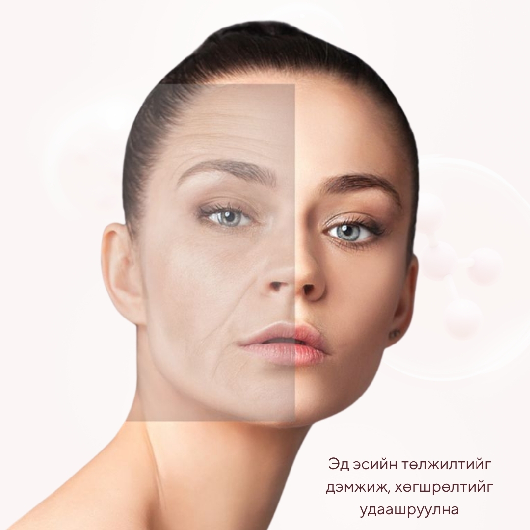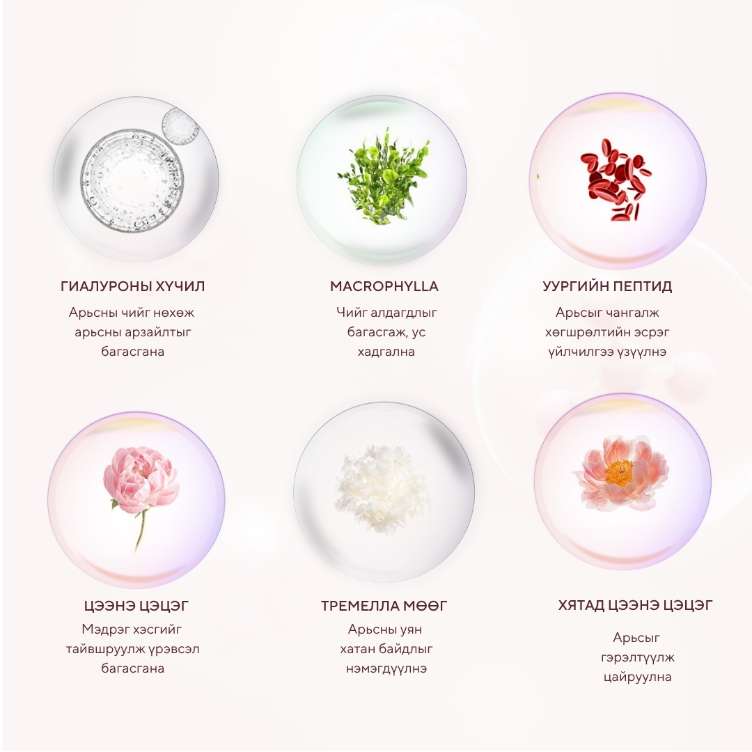 Бүх төрлийн арьсанд тохиромжтой 50% Арьсны өнгө сэргээж гэрэлтсэн тунгалаг болгоно 25% Гүний чийгийг нэмэгдүүлнэ 30% Арьсны дархлаа сайжруулж, нөхөн төлжилт хурдасгана 15% Үрчлээ тэнийлгэнэ 10% Арьсны уян хатан чанарыг нэмэгдүүлнэ 5% Арьсны нягтаршил сайжруулна