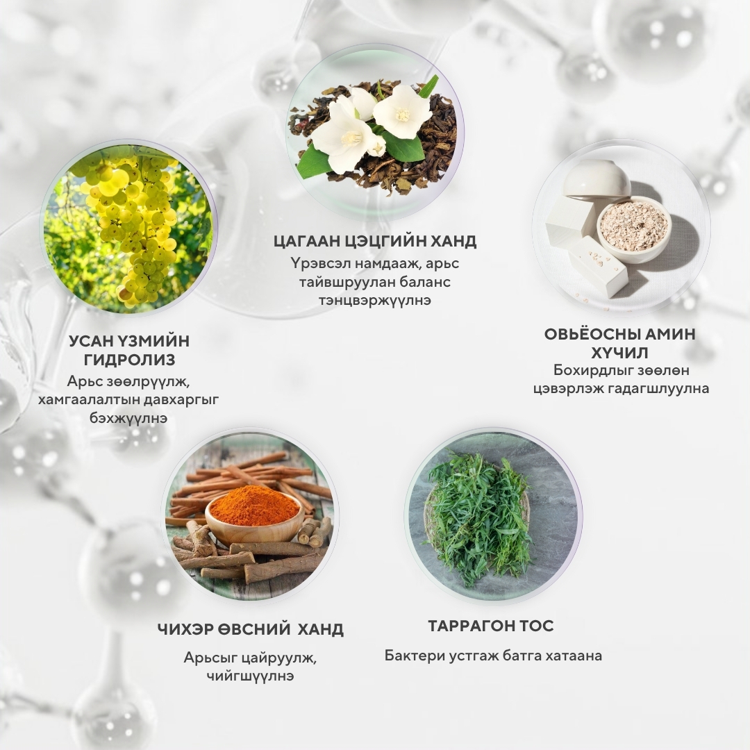 Тослог, үрэвсэлтэй, батгатай арьсанд тохиромжтой 52% Арьсны үрэвсэл намдаана 28% Байгалийн аргаар батга эмчилнэ 76% Арьсны ашигтай бактерийг дэмжинэ 33% Арьсны хэрэггүй нян бактери устгана 88% Илүүдэл тослогийн хянаж тэнцвэржүүлнэ