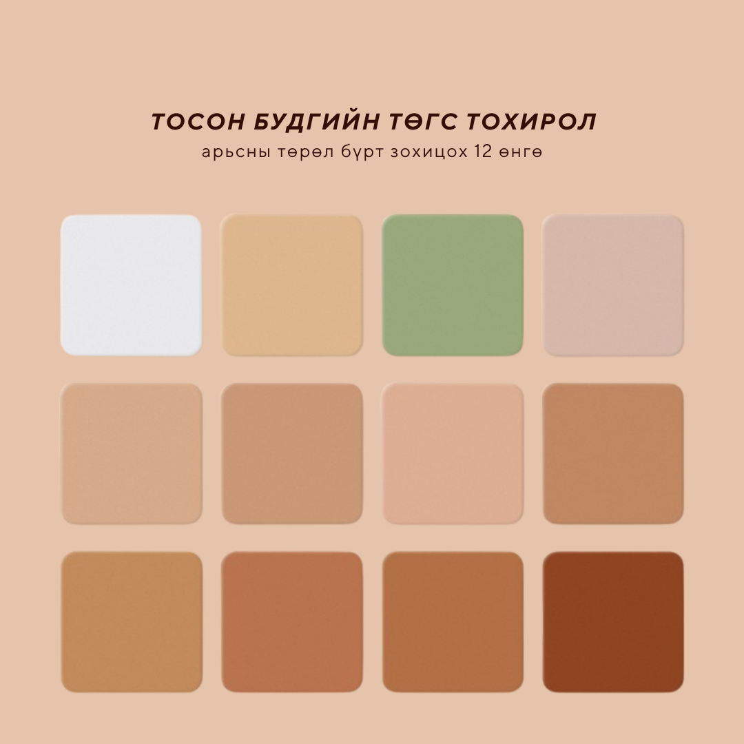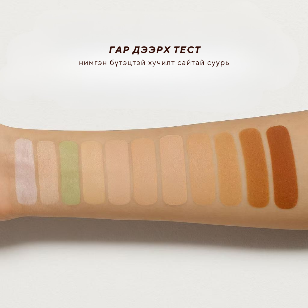 Нүүрний том жижиг сэвх, нөсөө толбо, нүдний хөхрөлт, батганы улайлт, сорви зэрэг бүх өө сэвийг дарах төрөл бүрийн өнгөний сонголттой. Мөн тосон гэрэл сүүдрийн бүх уусалттай өнгийг агуулсан